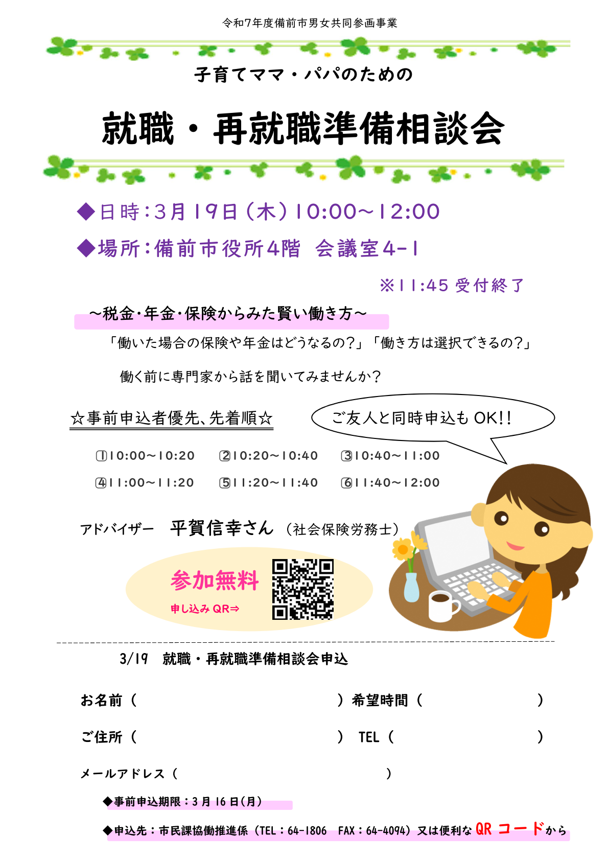 ○事前申込者優先、先着順で相談時間を決めます。ご友人と同時申込み可能です。