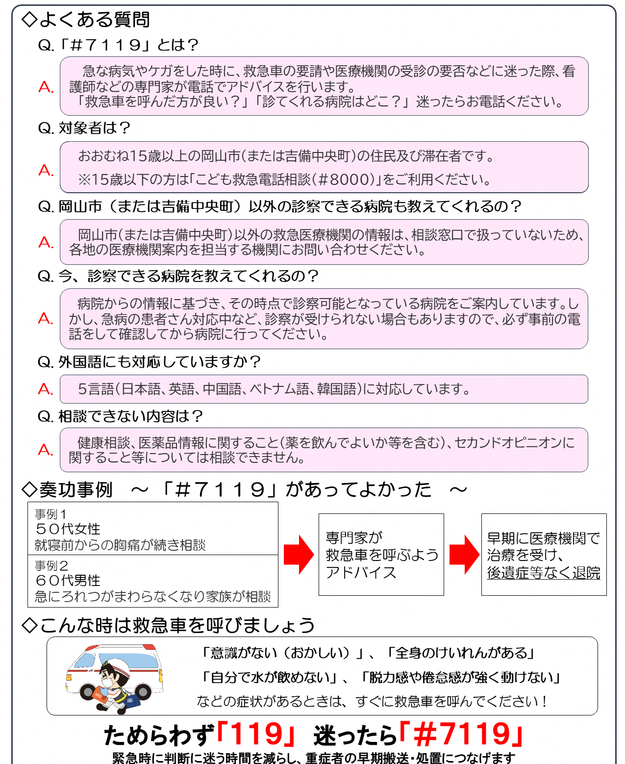 ※明らかにいつもと様子が違うなど緊急性が高い場合は、ためらわず「119番通報」してください。